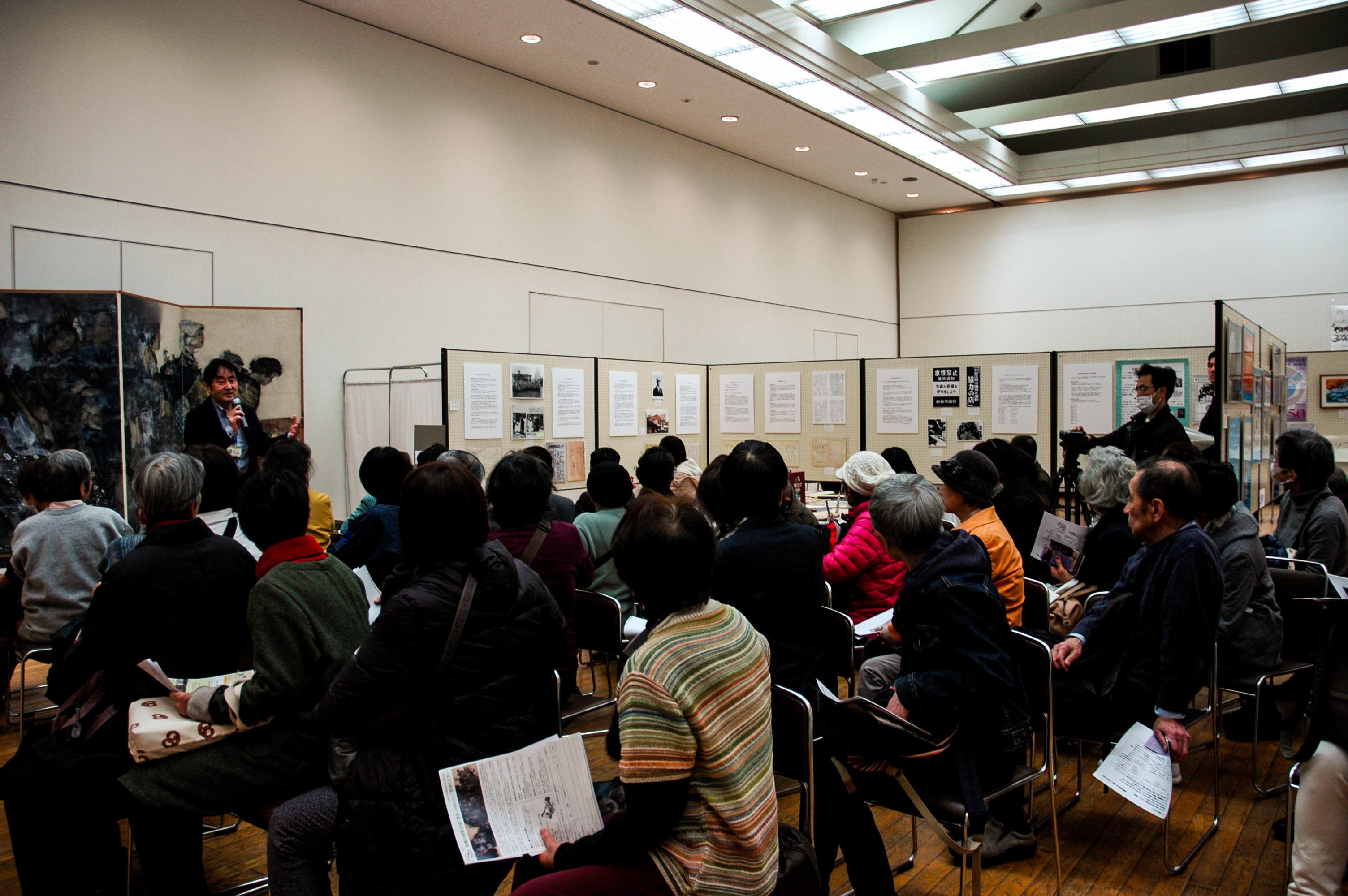 2018年5月に丸木位里・俊夫妻と原爆の図を知るために、埼玉の「原爆の図 丸木美術館」見学会を行いました。2018年12月には、本イベントに向けて、第五福竜丸展示館学芸員 市田真理さんと署名運動を始めた魚屋さんの息女竹内ひで子さんの講演会を行い、第五福竜丸事件や原水爆禁止署名運動に関する学びの場を作りました。