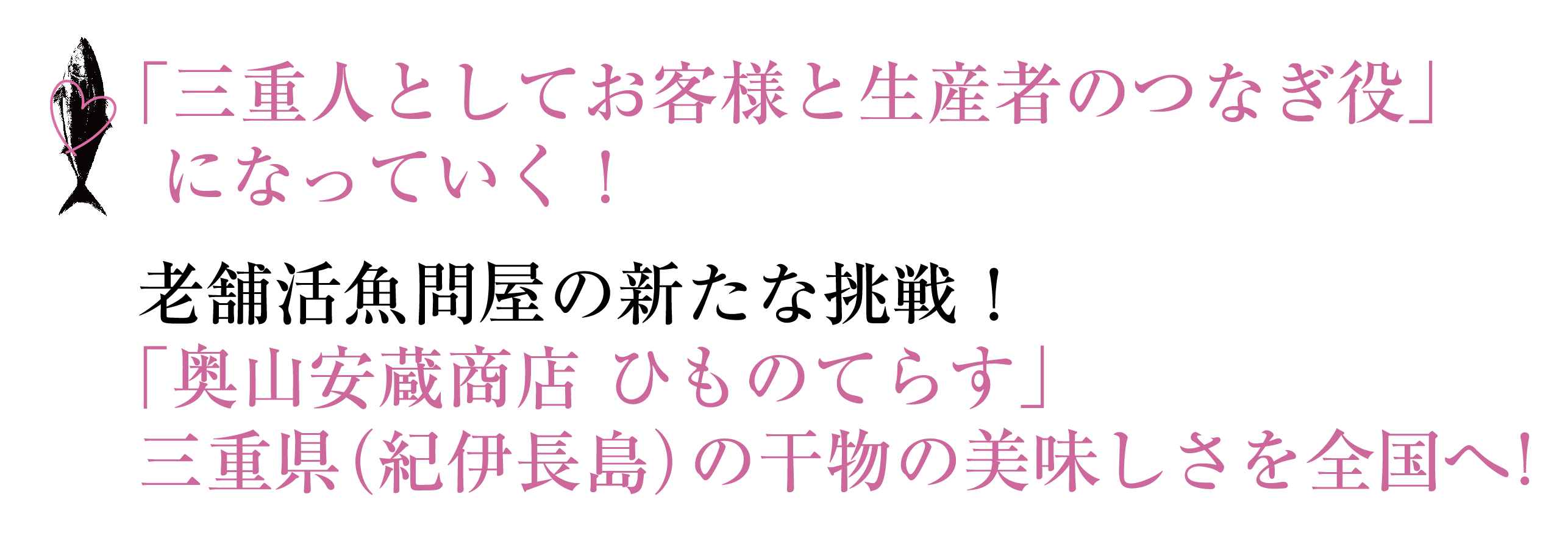 その中で、魚の新たな美味しさを発信すべく今回、地元三重県(紀伊長島)の「干物」に特化したまったく新しい業態の「奥山安蔵商店ひものてらす」をオープンいたします。干物は良さを伝えにくい商材であり、美味しさをわかってもらえるまでに時間がかかります。但し、老舗の活魚問屋だからこそ、魚の鮮度の目利きだけではない漁師や干物生産者とのコミュニケーション、生産工程から出荷に至るまですべてを把握し、生産者の想い・干物の美味しさをお客様へとご紹介することができます。