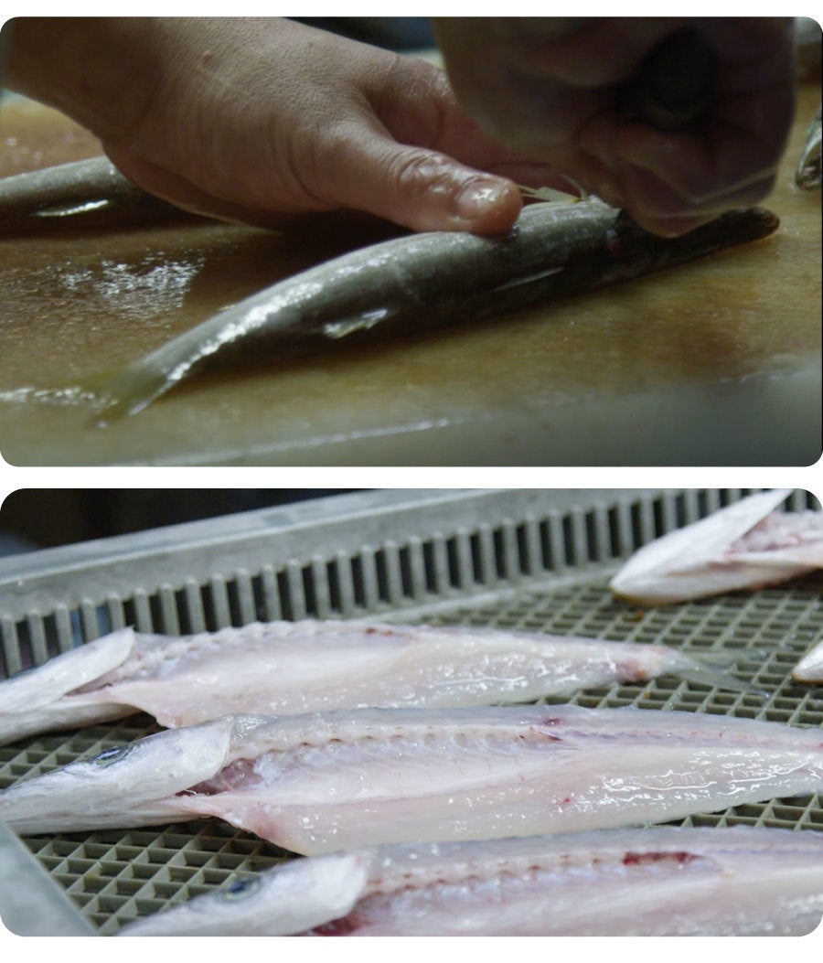 干物を製造するのは、紀伊長島の漁港に位置する「マルサ海産」。地元で獲れた魚しか使わず、作りたいものしか作らない徹底したこだわりの持ち主。すべての工程を手作業で行います。揚がってすぐの魚を手際よくさばき、洗い、天日干しされた魚は美しい。