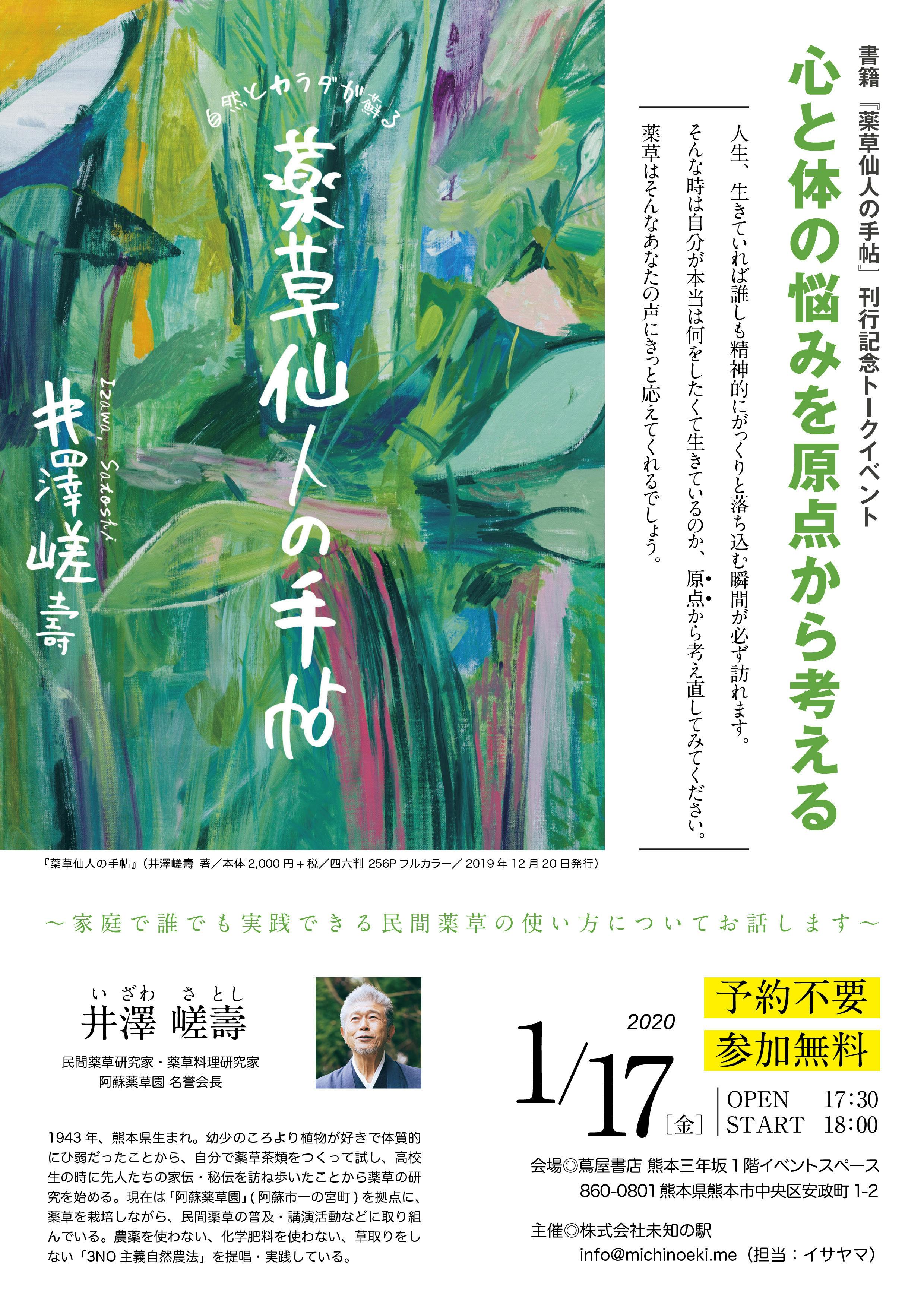 2020/01/09 19:34いよいよ来週、1/17に『薬草仙人の手帖』全国発売となります。発売日にあわせて、刊行記念トークイベントを蔦屋書店 熊本三年坂にて開催予定です。予約不要・参加無料のイベントですので、当日ご都合がつく方は気軽にお越しください。下記詳細です。書籍『薬草仙人の手帖』刊行記念トークイベント「心と体の悩みを原点から考える」 薬草仙人・井澤嵯壽による『薬草仙人の手帖』出版を記念してトークショーを蔦屋書店 熊本三年坂にて開催いたします。本書は「薬草って何?」という素朴な疑問から、採取・栽培、さらに「飲・食・浴・塗・洗」の薬草の5つの使い方まで、初心者にもわかりやすく解説する、民間薬草療法の入門書です。今回は家庭で誰でも実践できる民間薬草の使い方についてお話します。 【イベント詳細】日時:2020年1月17日(金) 17:30開場/18:00開演(約60〜80分で終了予定)会場:蔦屋書店 熊本三年坂1階イベントスペース 〒860-0801熊本県熊本市中央区安政町1-2主催:株式会社未知の駅 info@michinoeki.me(担当:イサヤマ) 予約不要・参加無料です。気軽にお越しください。 もっと見るその後の報告(1)