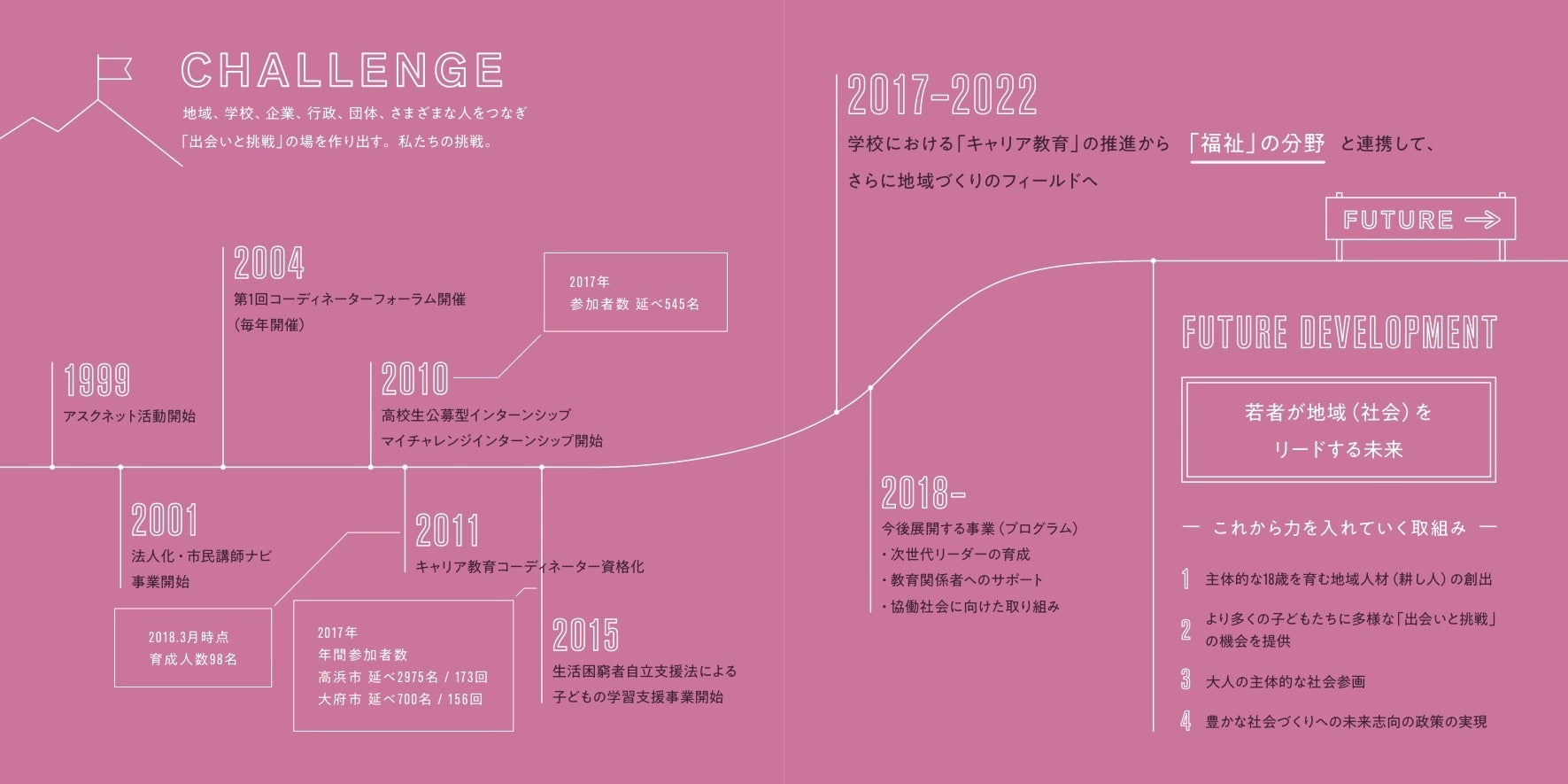 アスクネットは1999年に活動を開始し、社会人講座、インターンシップ、学習支援など、様々な活動に取り組んで参りました。昨年度から、新たに「主体的な18歳を社会に送り出す仕組みづくりとその活動をする」という5ヶ年の中期ビジョンを掲げ、これまでの学校領域の発展と共に、教育に関わる地域人材「耕し人」の創出、大人の主体的な社会参画、未来志向の政策の実現に取り組んでいきます。