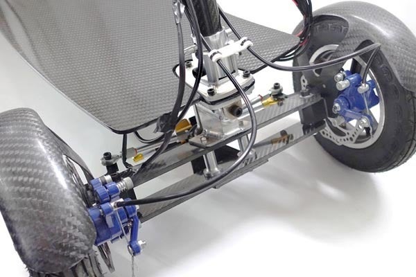 前輪後輪両方に専用設計( 特許出願済 )の4㎜厚カーボンファイバープレートサスペンションを使用しています。部品点数を減らし軽量化、バネ下が軽く、かつ低重心の本体設計を施しました。安定感のある走りを実感していただけます。