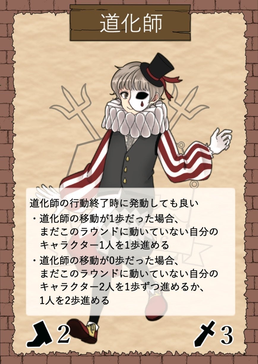 スタートプレイヤーマーカーを持っているプレイヤーは自分のキャラクターコマを1人移動させる。マスに入ったら効果を受ける。