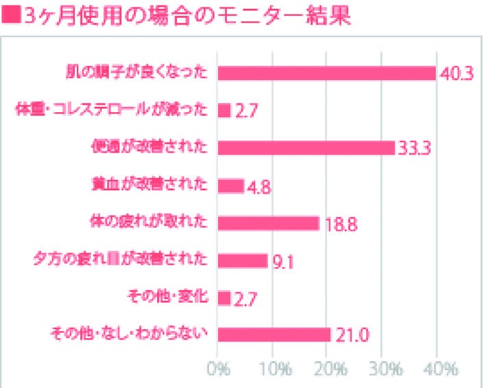 フォレスト・ベリー農園が実施した3か月モニター調査で、40%の人が「お肌の調子が良くなった」、33%の人が「便通が改善された」、18%の人が「カラダの疲れが取れた」と回答しています。