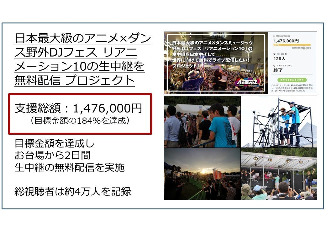 2017年の5月より 「日本最大級のアニメ×ダンス野外DJフェスリアニメーション10の生中継を無料配信」のクラウドファンディングプロジェクトをCAMPFIREにて実施。