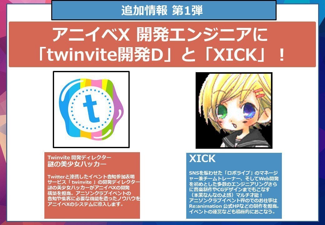 Twitterと連携したイベント告知参加表明サービス「 twinvite 」の開発ディレクター「謎の美少女ハッカー」がアニイベXの開発構築を担当。アニソンクラブイベントの告知や集客に必要な機能を造ったノウハウをアニイベXのシステムに導入します。