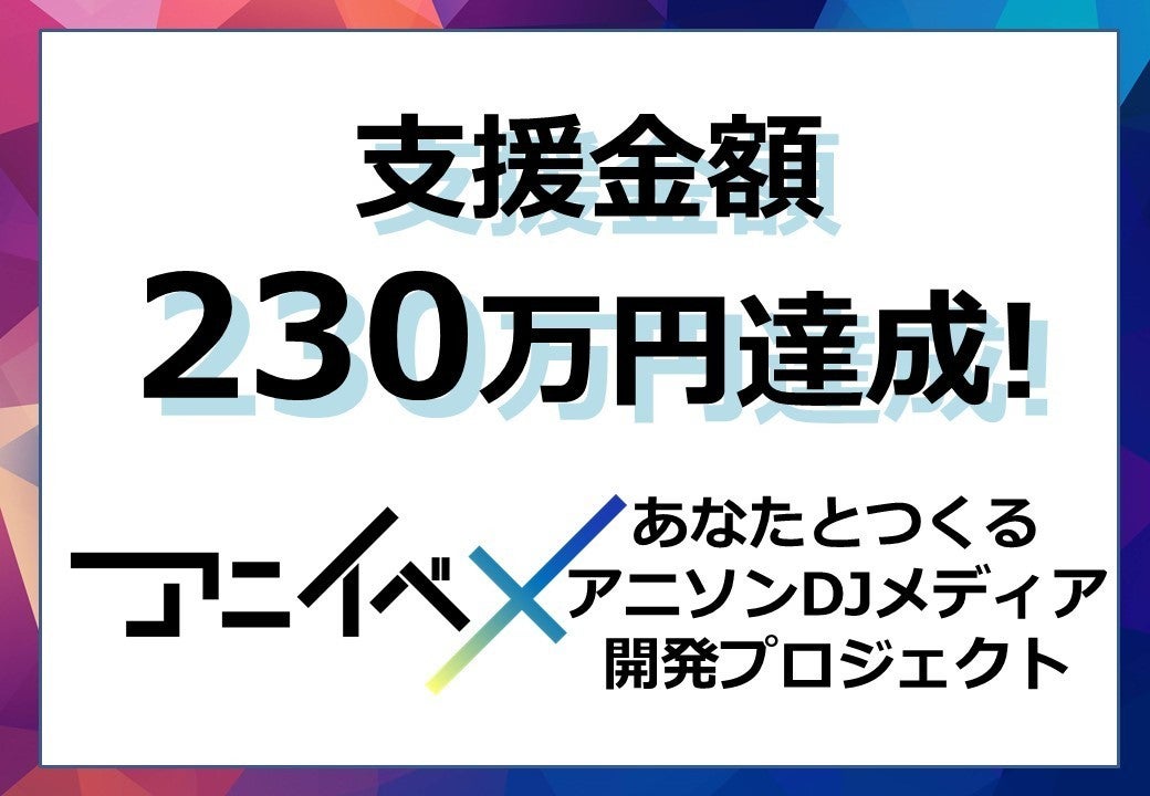 皆様のご支援により、2月26日(火)に230万円の目標を達成しアニソンDJメディア「アニイベX」サービスのスタートが決定しました。深く感謝申し上げます。