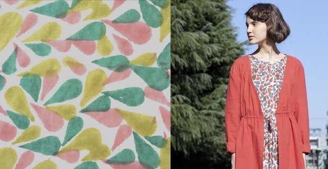 作品作りの工程は、私がデザインした柄を職人さんたちが木版を作り、ひと版ひと版押していく技法で作られます。出来上がった生地からイメージを得て、布が映える形を考えながら大切に作品をデザインしていきます。縫製も同じ工房で行います。