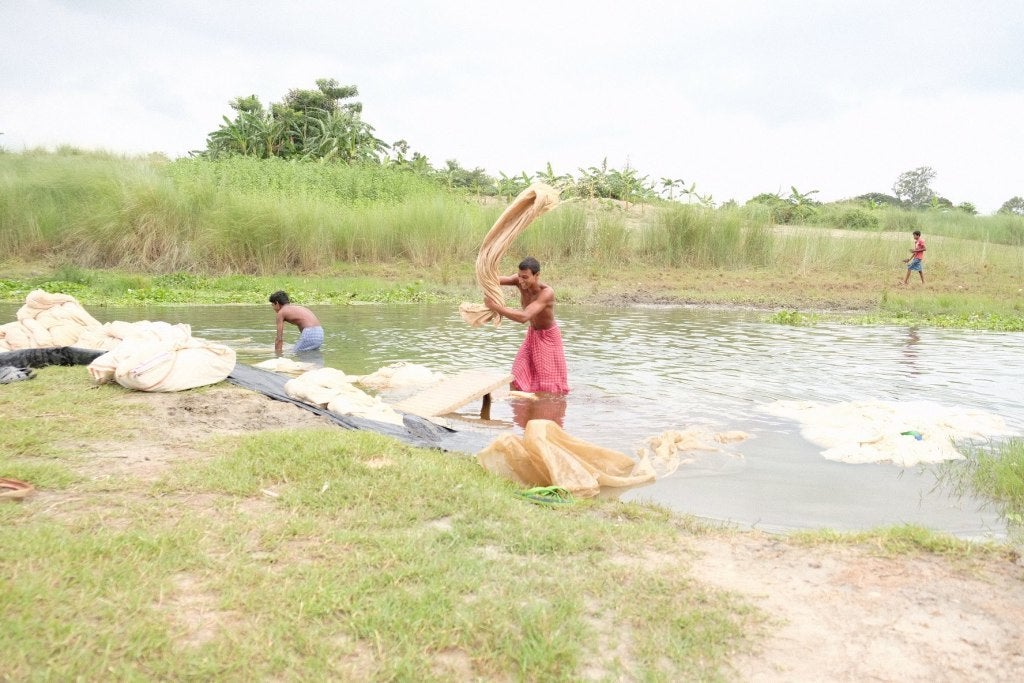 どうせ作るならこだわりたいという私の願いを聞いて頂き、手織りの生地を作っている村を探すところからスタートしました。いくつかの村を訪れて、そこでどんな人が織りどう暮らしているかなどを体感し、一つの工房にとても心を奪われ、そこに決めました。 庭には植物がたくさん育ち、野良牛がのんびりとお庭を散歩するような、長閑で素敵な場所でした。