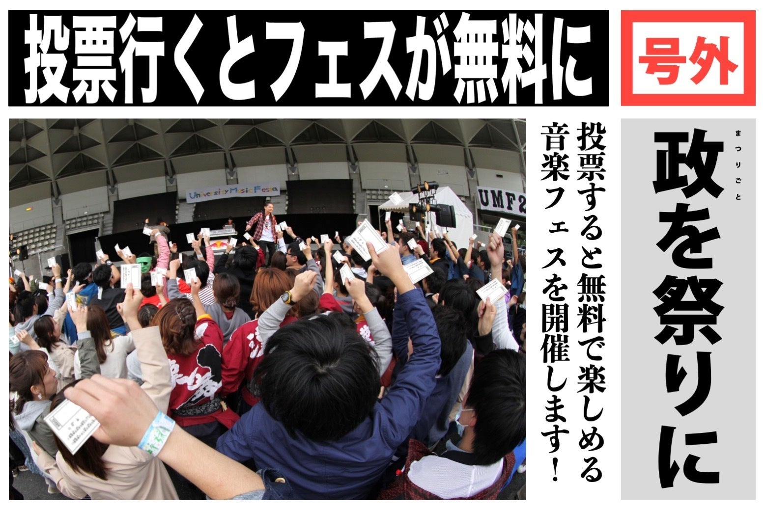 選挙で投票をした際にもらうことができる"投票済証明書”や投票所の前で撮った写真など、投票に行ったことを示せると入場できる音楽フェスというものをつくります。
