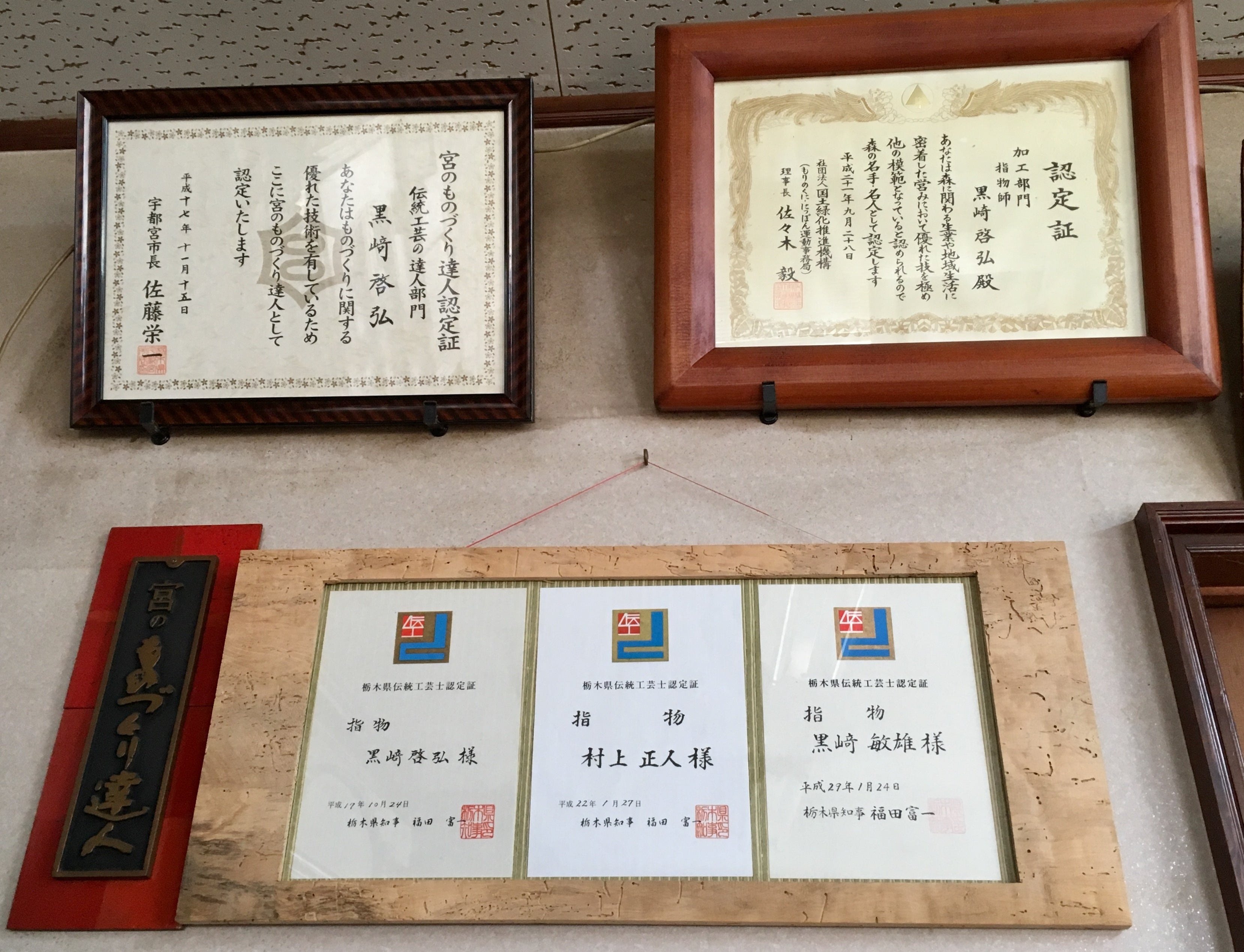 クロサキ工芸に所属する職人、黒﨑 啓弘・村上 正人・黒﨑 敏雄は、「栃木県伝統工芸士 指物」に認定されています。
