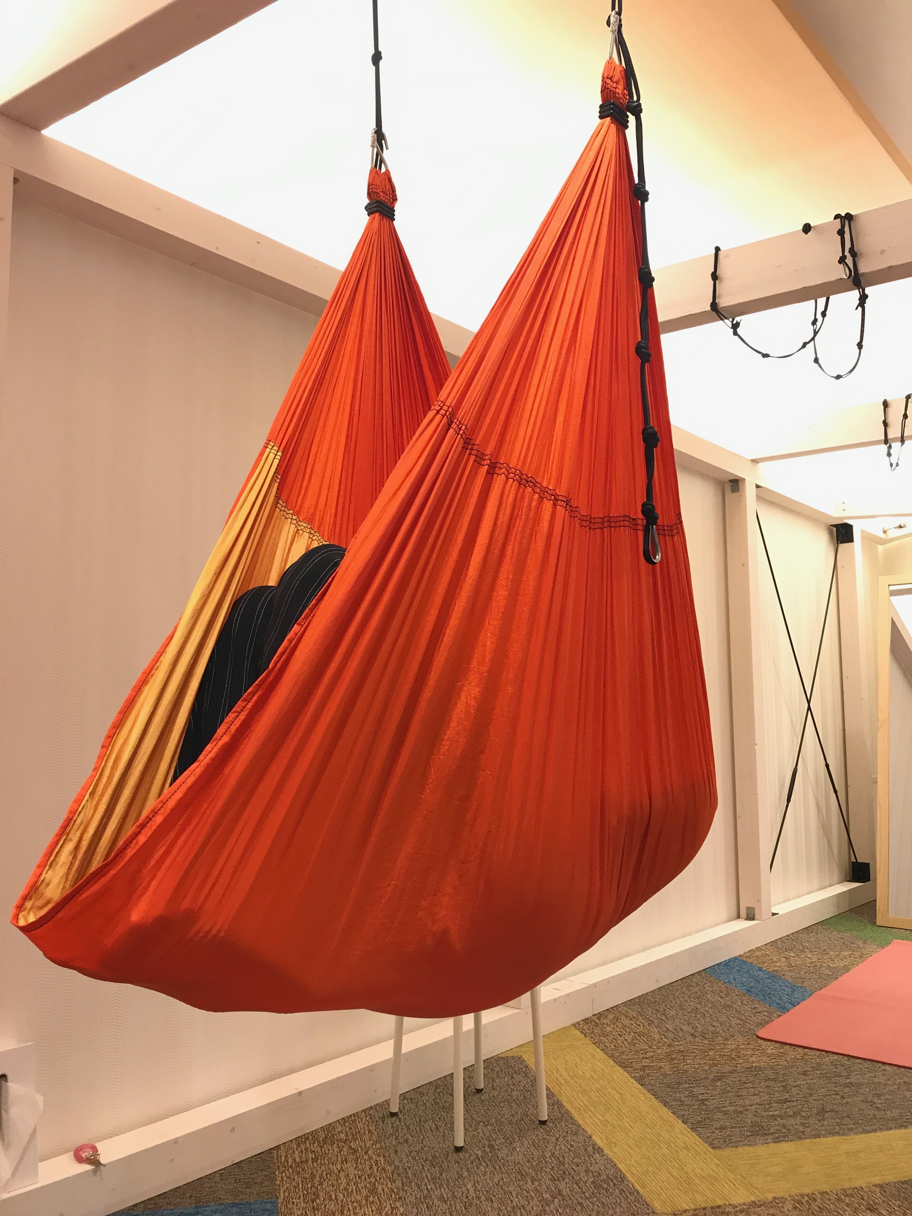 ハンモックを使うことで普段できない感覚が味わえたり、また障害のある人や怪我をしている人のサポートになります。