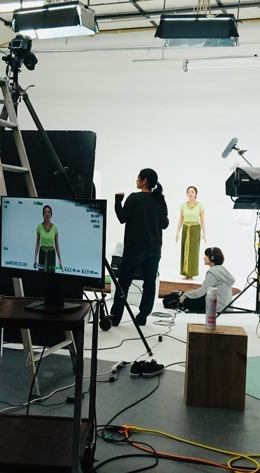 モデルさんに、タイ式ヨガ(ルーシーダットン)を指導しています。