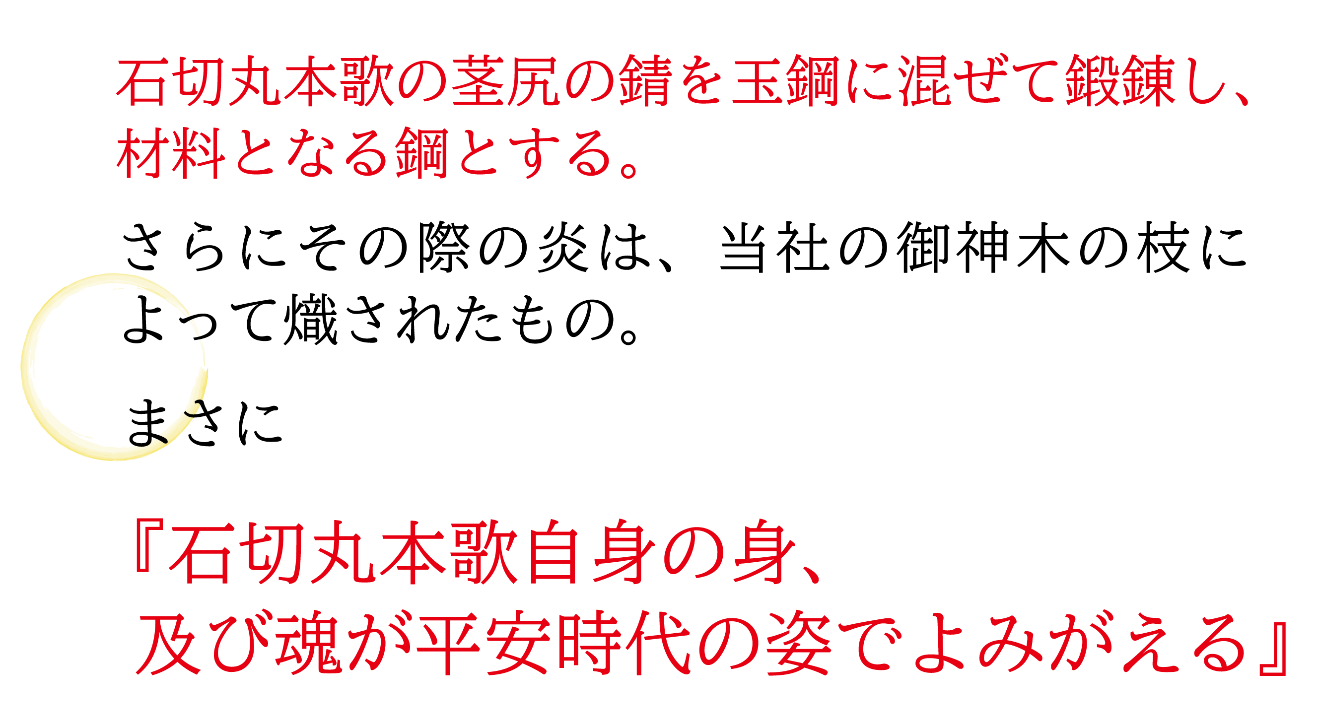 特に今回の作刀にあたり、石切丸本歌(いしきりまるほんか)の茎尻(なかごじり)の錆と和釘(わくぎ)と玉鋼(たまはがね)を材料として使用致します。また火造りは当社の御神木を松炭に混ぜ使用いたします。まさに『石切丸本歌自身の身、及び魂が平安時代の姿でよみがえる』こととなり、これまでに類を見ない取り組みです。