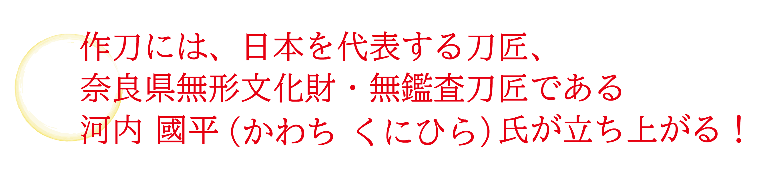 作刀をするのは、日本を代表する刀匠である、奈良県無形文化財・無鑑査(むかんさ)刀匠である河内 國平(かわち くにひら)氏です。河内刀匠のお父様、第14代河内守 國助(かわちのかみ くにすけ)は当社の奉納刀の管理を行っておりました。その御子息である河内刀匠は、幼少期を石切劔箭神社の参道で過ごしている御縁ばかりでなく、平成26年に最も刀匠として権威のある「正宗賞」を受賞され、最近でも平成の名工大賞を受賞される当代最高の技量を持ち、奈良に住まいされていることから、当社として依頼するにあたり河内刀匠以外には考えられないと思い、作刀をご依頼しております。