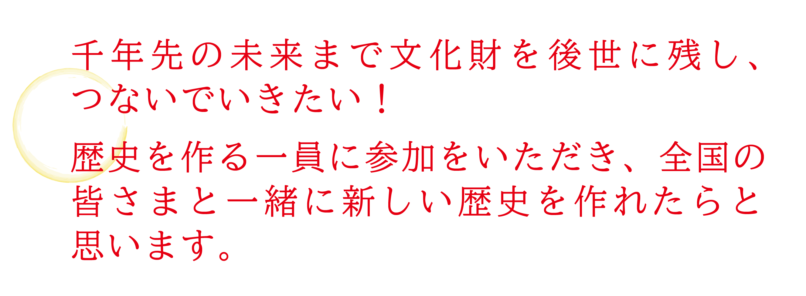 全国の皆様と一緒に奉納を行い、文化財を後世につないでいくとともに、新しい歴史を作ってまいりたいと思います。