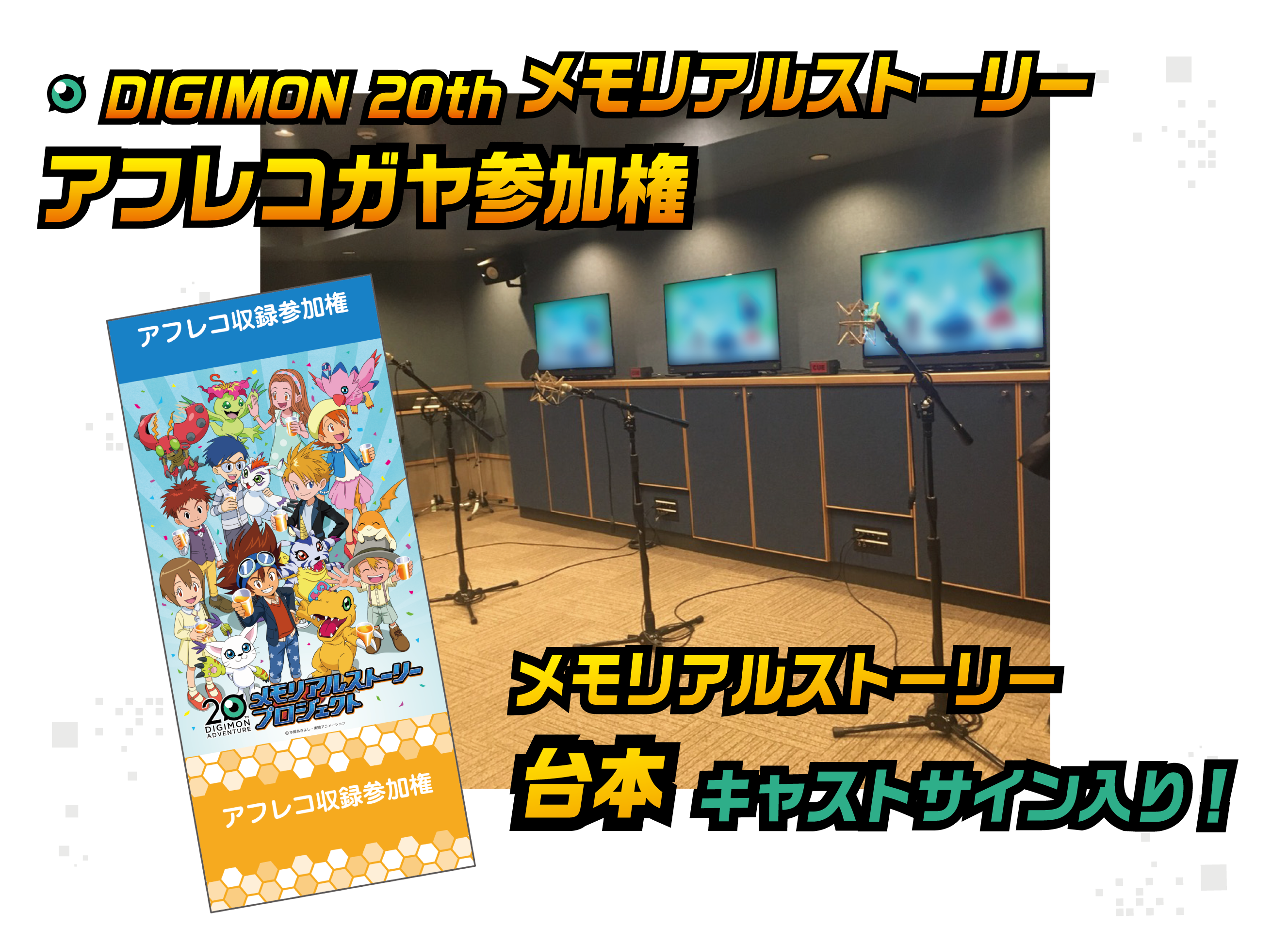 劇場版『デジモンアドベンチャー LAST EVOLUTION 絆』では描ききれなかった物語を映像化する「デジモンメモリアルストーリー」のアフレコにガヤとして参加ができる権利が登場!収録の見学も可能!さらにキャストのサイン入り台本をお渡しいたします。