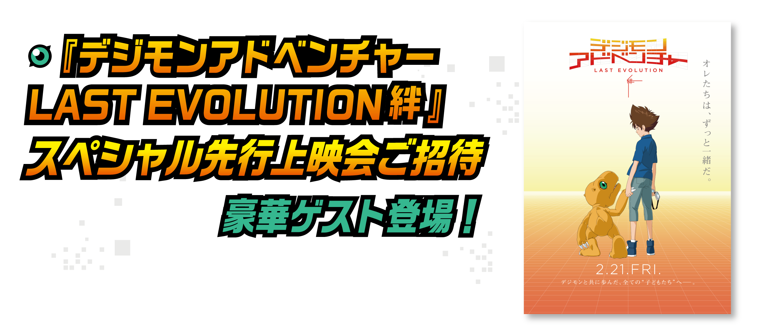 『デジモンアドベンチャー LAST EVOLUTION 絆』のスペシャル先行上映会にご招待。2020年2月21日(金)の公開に先駆けて映画をご覧頂けます。豪華ゲストによるトークショー付き。