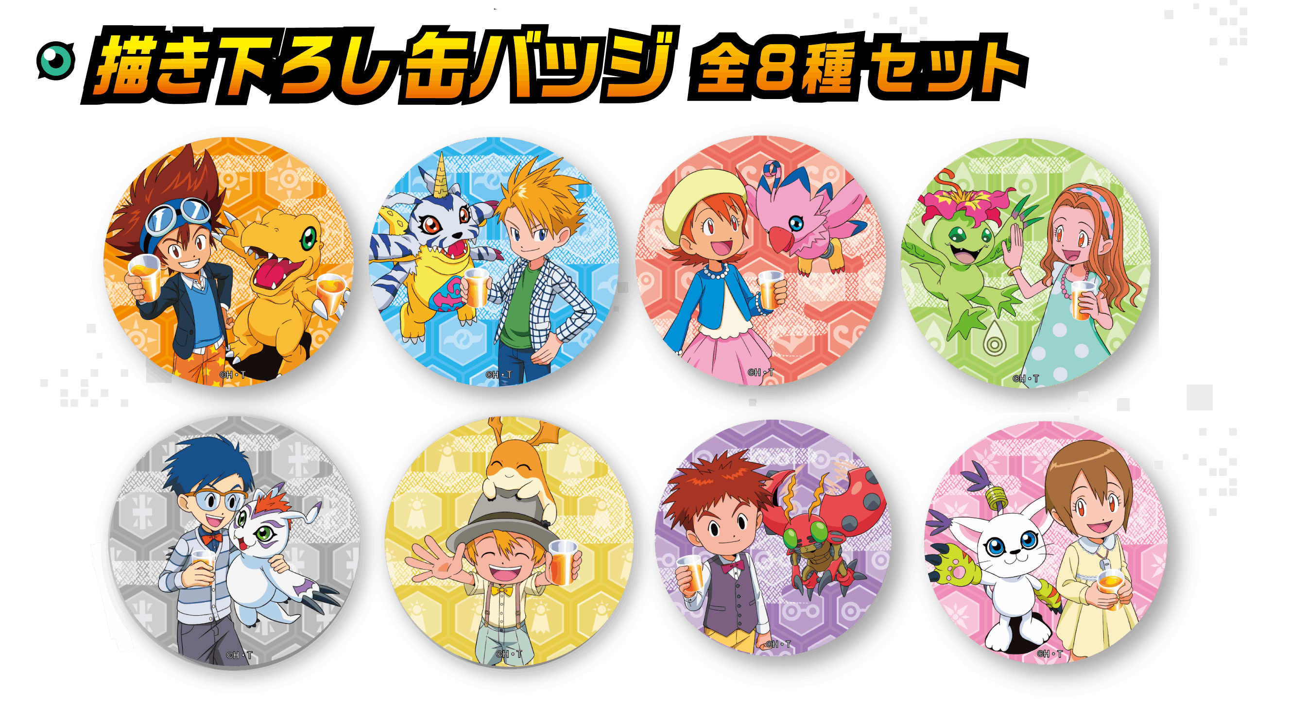 本プロジェクトのために描き下ろしたビジュアルを使用した缶バッジ(8種セット)が登場。