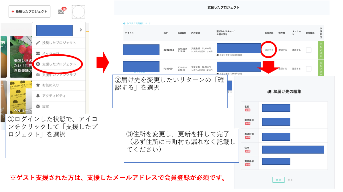 A:マイページ内の「支援したプロジェクト」にて「備考欄」→「確認する」より変更可能です。リターンの履行作業に関わるので、プロジェクト掲載中に修正をお願いします。(手順は前述の住所変更の画像を参考にしてください)