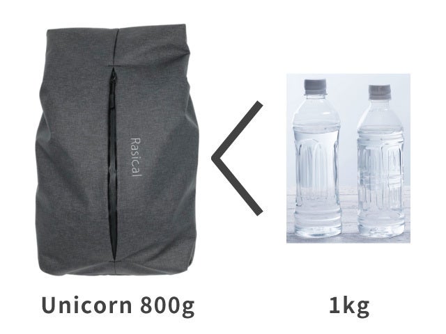 ユニコーンは改良前はさらに軽い645gでしたが、より長くご利用いただける品質向上のため、生地量を増やしたりなどの結果少し重くなり約800gとなっています。それでもこのサイズのバックパックとしてはかなり軽く、多数ある軽さを謳う多機能バッグも多くは1kg以上のものや中には2kg近いものも存在する中ではかなり軽量の部類に入ります。