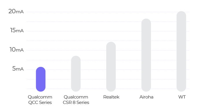 現在、流通しているほとんどのBluetooth 4.0チップセットの消費電力は約20mA(ミリアンペア)以上です。 また、一部のBluetooth 5.0チップセットは、電力消費を10mA以上に制御できています。 しかし、QCCシリーズは消費電力が6mA以下で競合他社の約半分となっていて、これは間違いなくBluetooth市場では最高の数値です。 * mAは、電気伝導体を流れる電流と、電子の流速の尺度の単位です。