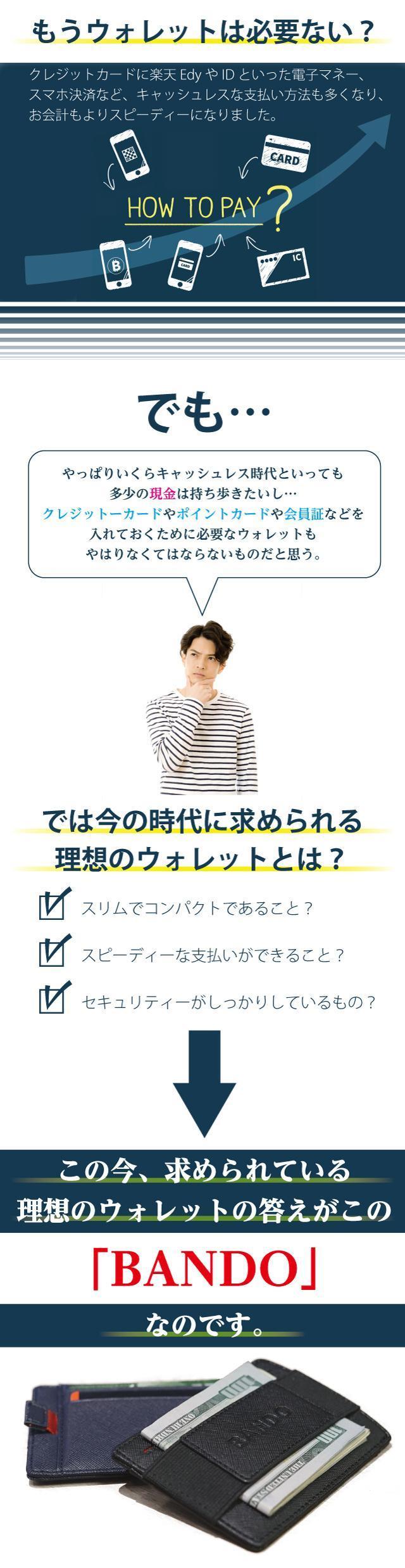 【BANDO】はシンプルなのに機能的、そしてとてもスリムなウォレットです。米国クラウドファンディングKickstarterとIndiegogoで合計4,100万円の資金調達に成功したアメリカで大ヒットしたスリムウォレットです。