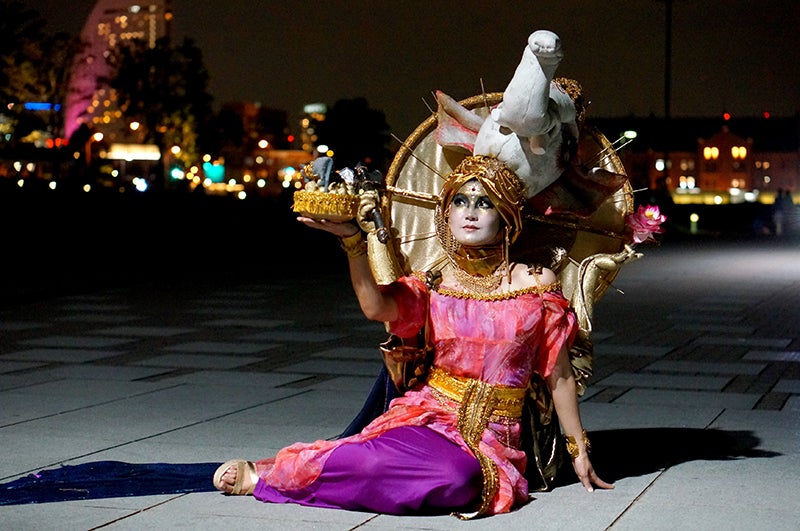 自分で制作した被り物や小物を身につけ、メイクをし、完全に「神などの化身になりきる」というオリジナルの変身計画です。