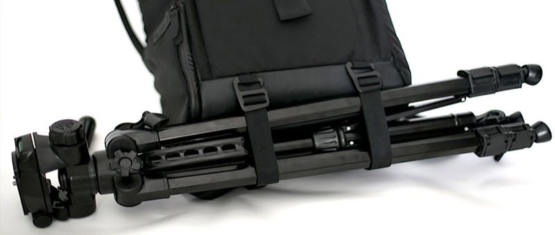 DAYFARERバックパックのボトムに取り付けて、三脚やヨガマットを装着できる。