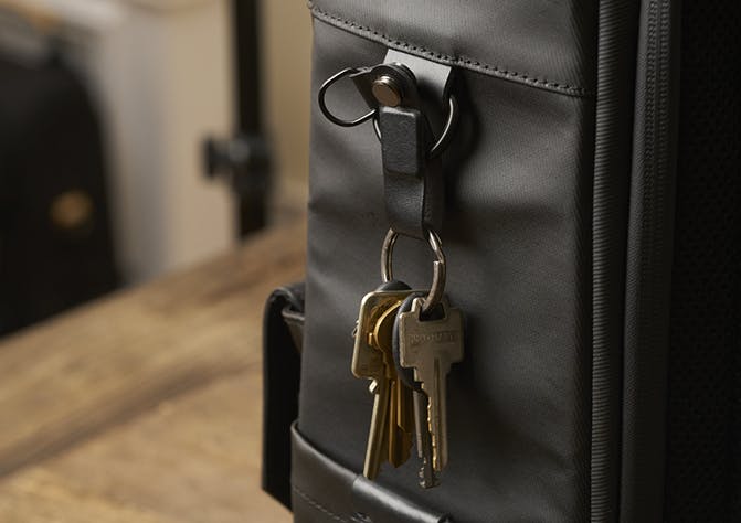鍵を取り付けられるDリング・サイドアタッチメント。