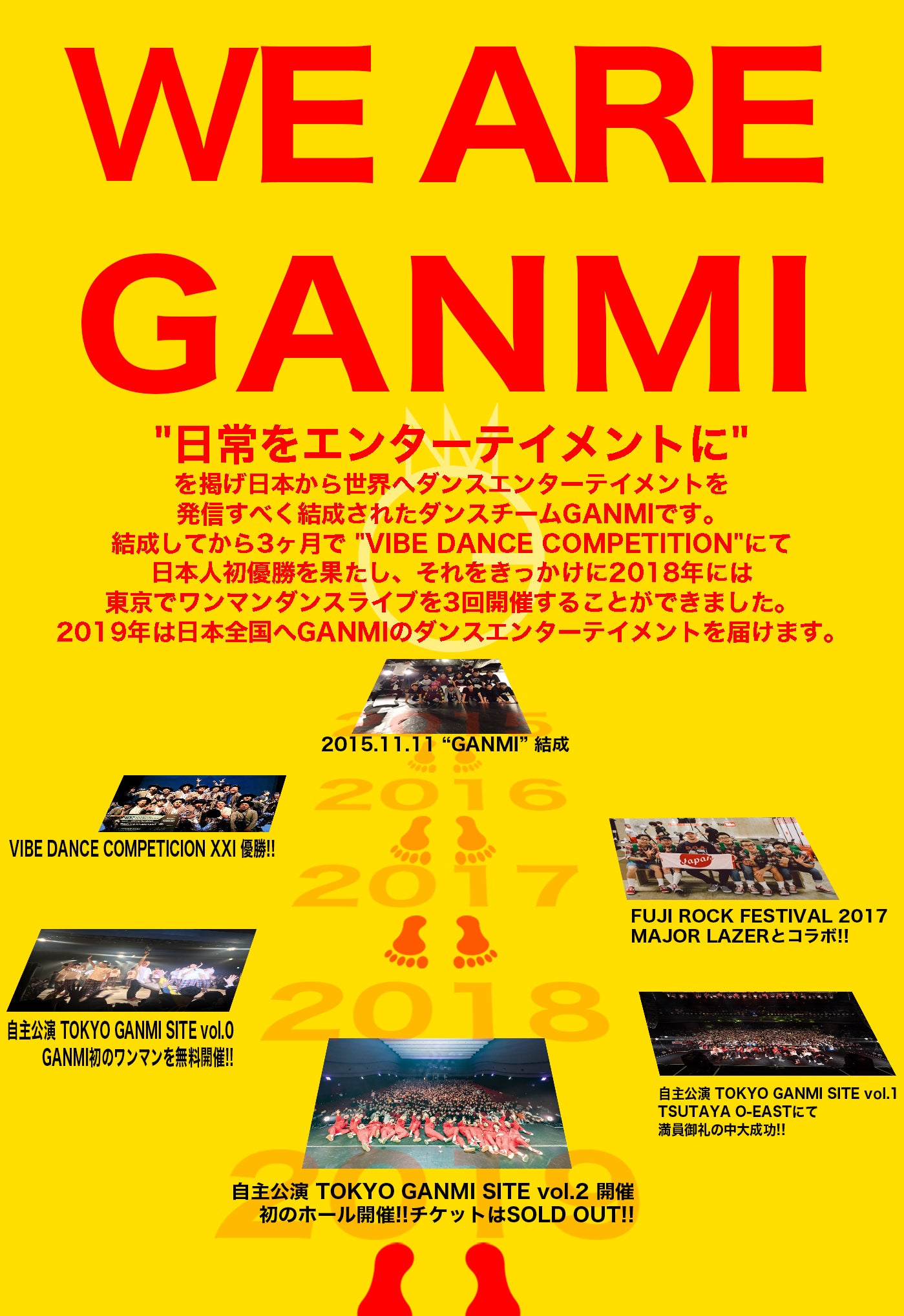 2016年2月1日午後21時@米ロサンゼルス。有名な言葉「未来は予測するものではない。自らが創るものだ」をまさに地で行けた瞬間でした。世界最高峰の大人数振付け作品コンテスト『VIBE DANCE COMPETITION XXI』で僕達GANMIが日本チーム初の優勝を獲得。この予期せぬ優勝からGANMIの新しいステージが始まりました。