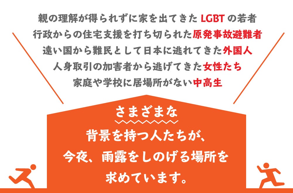 これらのSOSに対応するため、それぞれの分野で支援活動を続けている民間団体は、必要に応じてネットカフェやビジネスホテルの宿泊費の支給、無料で宿泊できるシェルターの提供などを行なっています。
