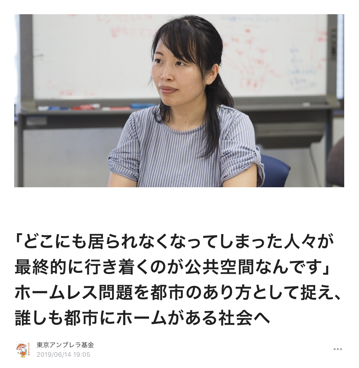 2019/06/14 19:28プロジェクトを応援いただきありがとうございます!東京アンブレラ基金事務局です。私たち「東京アンブレラ基金」で協働する各団体を紹介するインタビュー&レポートの第九弾を公開。ARCH (Advocacy and Research Centre for Homelessness) 河西奈緒さんにお話をうかがいました!●「どこにも居られなくなってしまった人々が最終的に行き着くのが公共空間なんです」ホームレス問題を都市のあり方として捉え、誰しも都市にホームがある社会へhttps://note.mu/umbrellafund/n/n4cbe208da539◆ ◇ ◆◆ ◇ ◆◆ ◇ ◆●「どこにも居られなくなってしまった人々が最終的に行き着くのが公共空間なんです」ホームレス問題を都市のあり方として捉え、誰しも都市にホームがある社会へhttps://note.mu/umbrellafund/n/n4cbe208da539 もっと見る