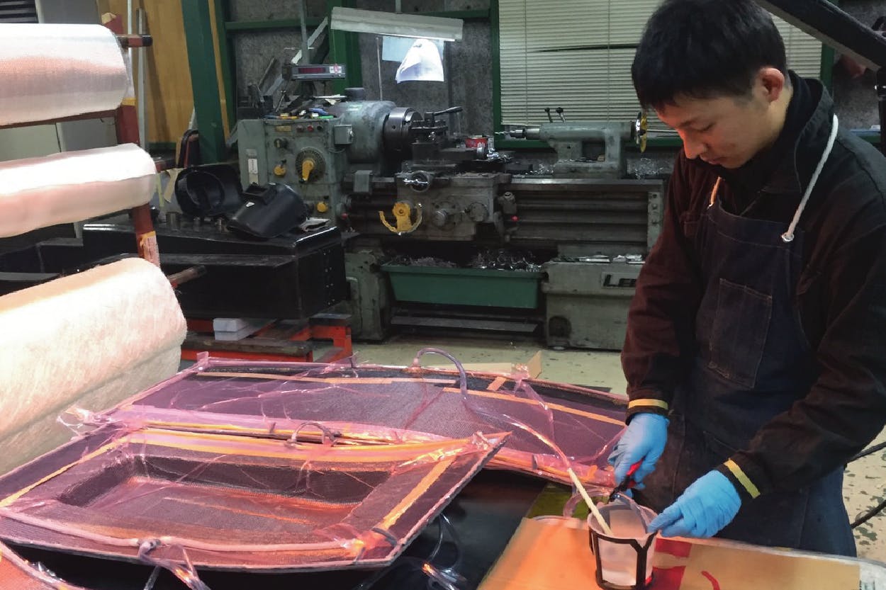 カーボン成形は当社の得意分野。シャーシ作りから組み立てまで、一つ一つ手作業で行っています。