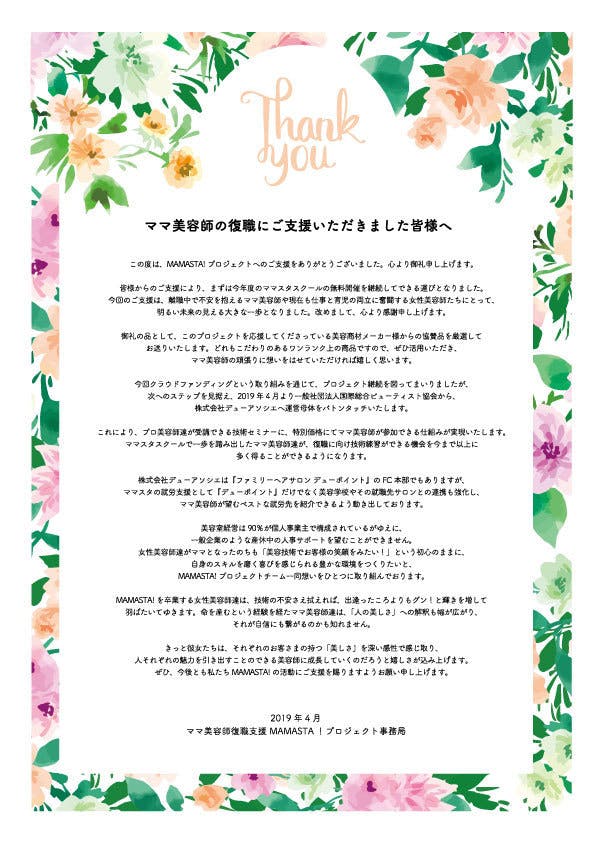 2019/07/07 14:03この度ご支援いただいたみなさまには、サンクスレターと返礼品を送らせていただきました。『サロンオーナー様向けリターン』にてご支援いただいた方は、MAMASTA!のWebサイト、SNS(Facebook・Instagram・Twitter)で、インタビューとサロン紹介を掲載させていただいております。ぜひご覧ください!MAMASTA!公式Webサイトhttps://mamasta.minnano-beauty.jp/MAMASTA!Facebookページhttps://www.facebook.com/mamabiyoushi/MAMASTA!Instagramhttps://www.instagram.com/iba.mamasta/MAMASTA!Twitterhttps://twitter.com/mamasta_sns もっと見るママ美容師さんに就労機会の提供を行いました。