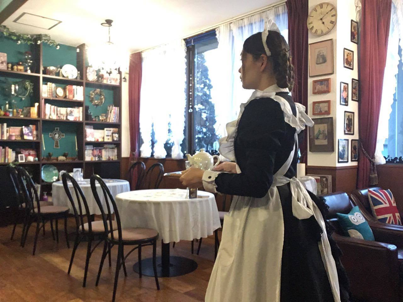 イギリスのアフタヌーンティーの文化への憧れから、イギリスのクラシカルなメイド姿でお客様をお迎えして給仕、おもてなしさせていただております。