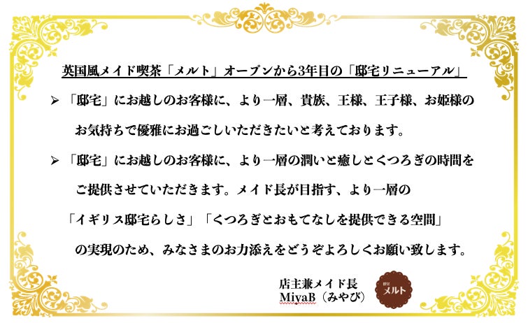 日々の生活にほんの少しの潤いや、息抜きや、癒しの時間をお届けしたい。メイドの手作りのお菓子と紅茶と素敵なアート作品に囲まれて過ごす時間に、貴方は貴族にも王様、王子様やお姫様にだってなれる。