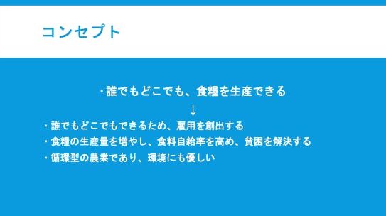 私達は大学入学当初から、多くの人の助けとなるビジネス提案をしたいと考えていました。人は食糧を購入するために働きます。つまり雇用を創出しながら、食糧を生産することは雇用問題・食料問題を同時に解決できる手段になり得るのではと考え、上記の事業プランを作成しました。