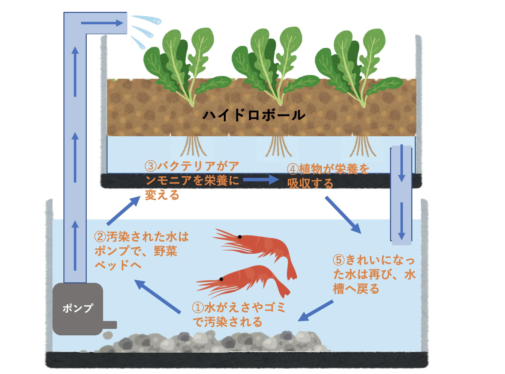 水耕栽培(土を使わずに水で栽培する農業)と水産養殖(魚やえびの養殖)を同時に行う、循環型の有機農業のことをいいます。