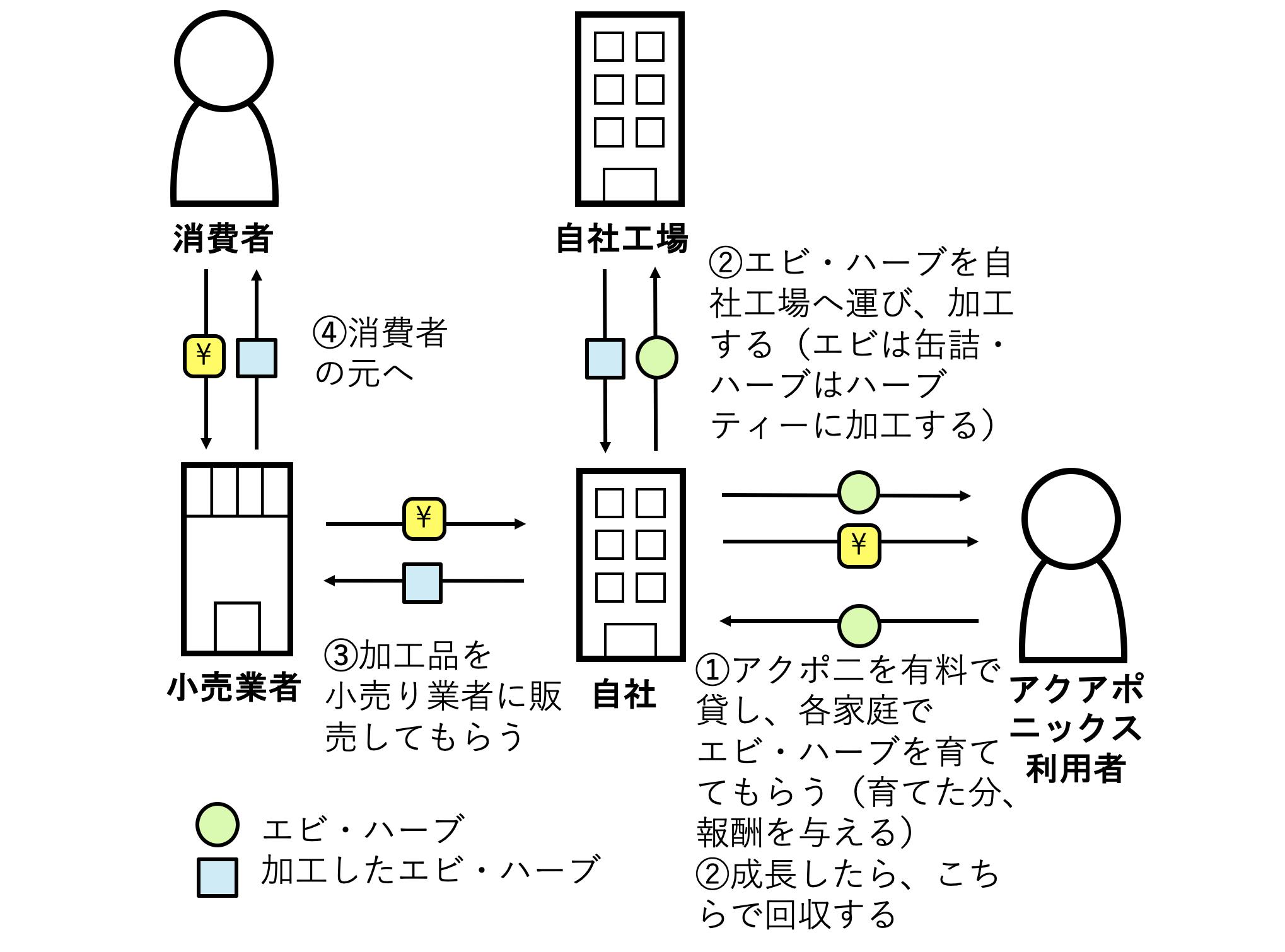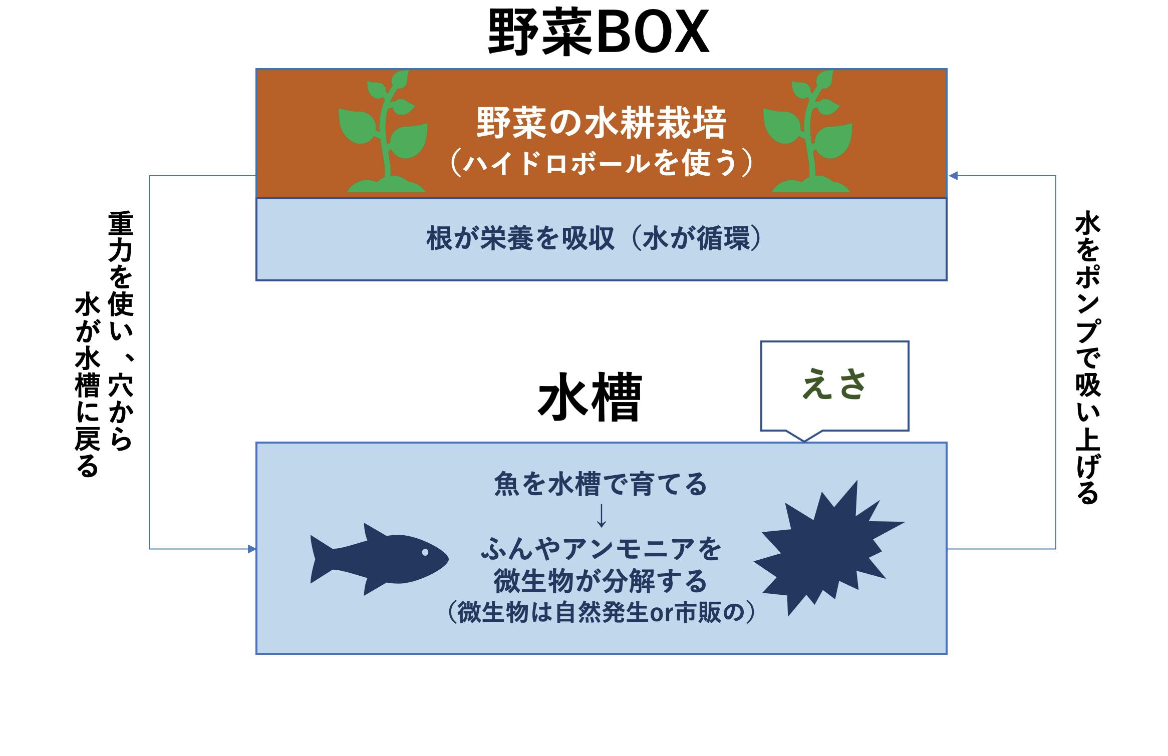 魚やエビの排出物を微生物が分解し、植物がそれを栄養として吸収、浄化された水が再び魚の水槽へと戻る、生産性と環境配慮の両立ができる生産システムです。