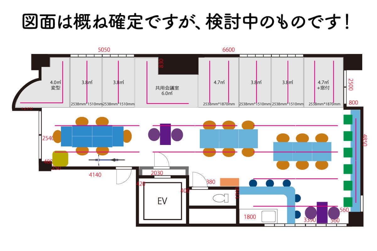 レイアウトは以下のように、中央を横に切り返して共用部(ラウンジスペース)と個室スペース(オフィススペース)を切り分けました。