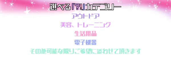 また、支援者様にはお好みのカテゴリーをお選び頂き、その中で僕がチョイスしたオススメ商品をお送りさせて頂きますので、『私、キャンプなんてしないのにキャンプ用品が送られてきた・・・』『俺、別に美容の事は気にしてないけど・・・』と言った、めちゃくちゃにご期待を裏切る様な事はありません!(僕のセンスを信じて下さい!)