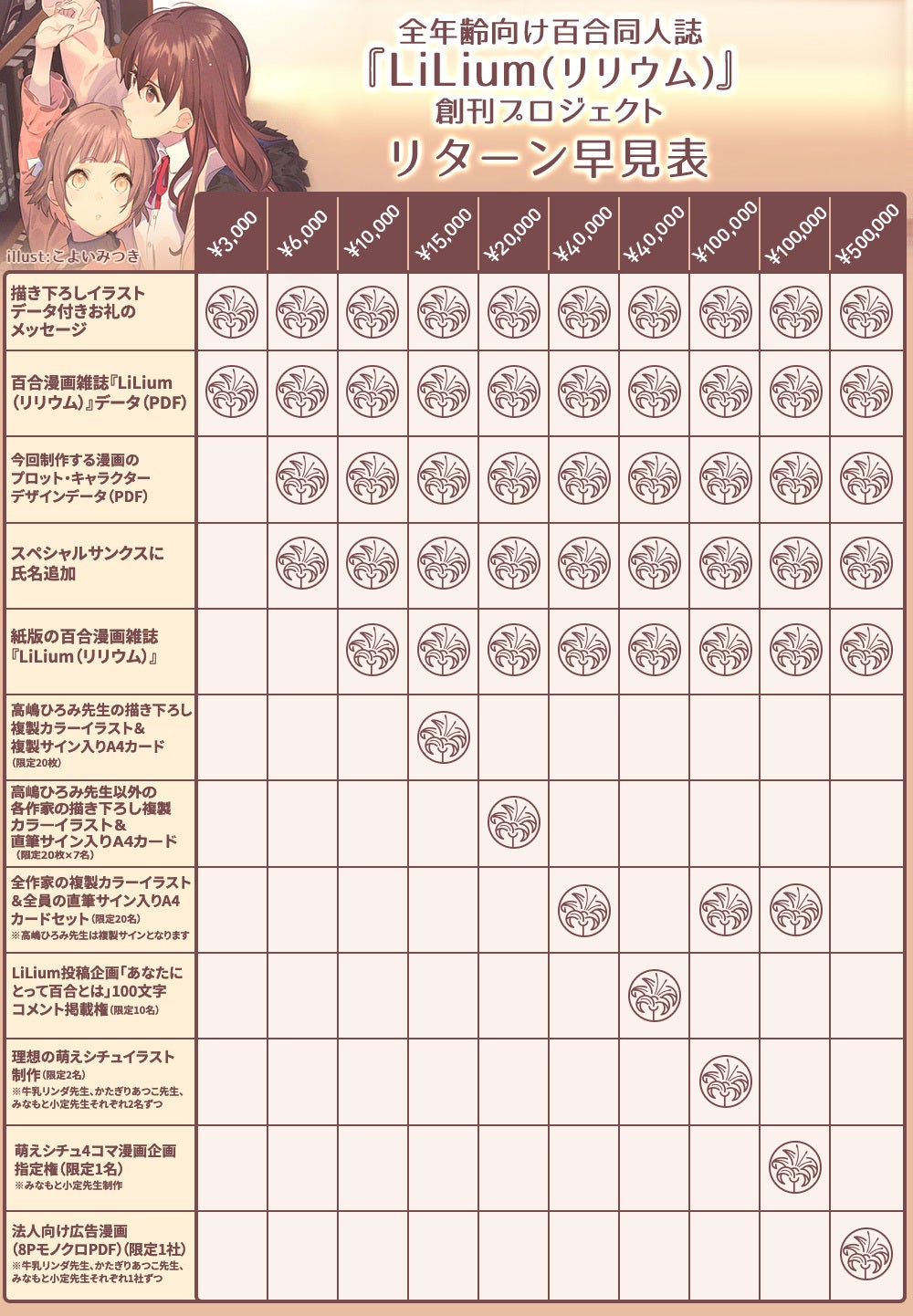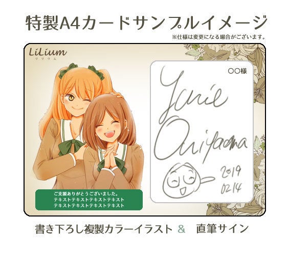 今回は、皆様とともに作る百合漫画雑誌を目指すので、豪華なリターン品を沢山ご用意いたしました!まずは、同人誌ということで紙雑誌版の「LiLium」。そして、各先生方にお願いして、複製カラーイラスト&直筆サイン入りカード(A4サイズ)もあります!