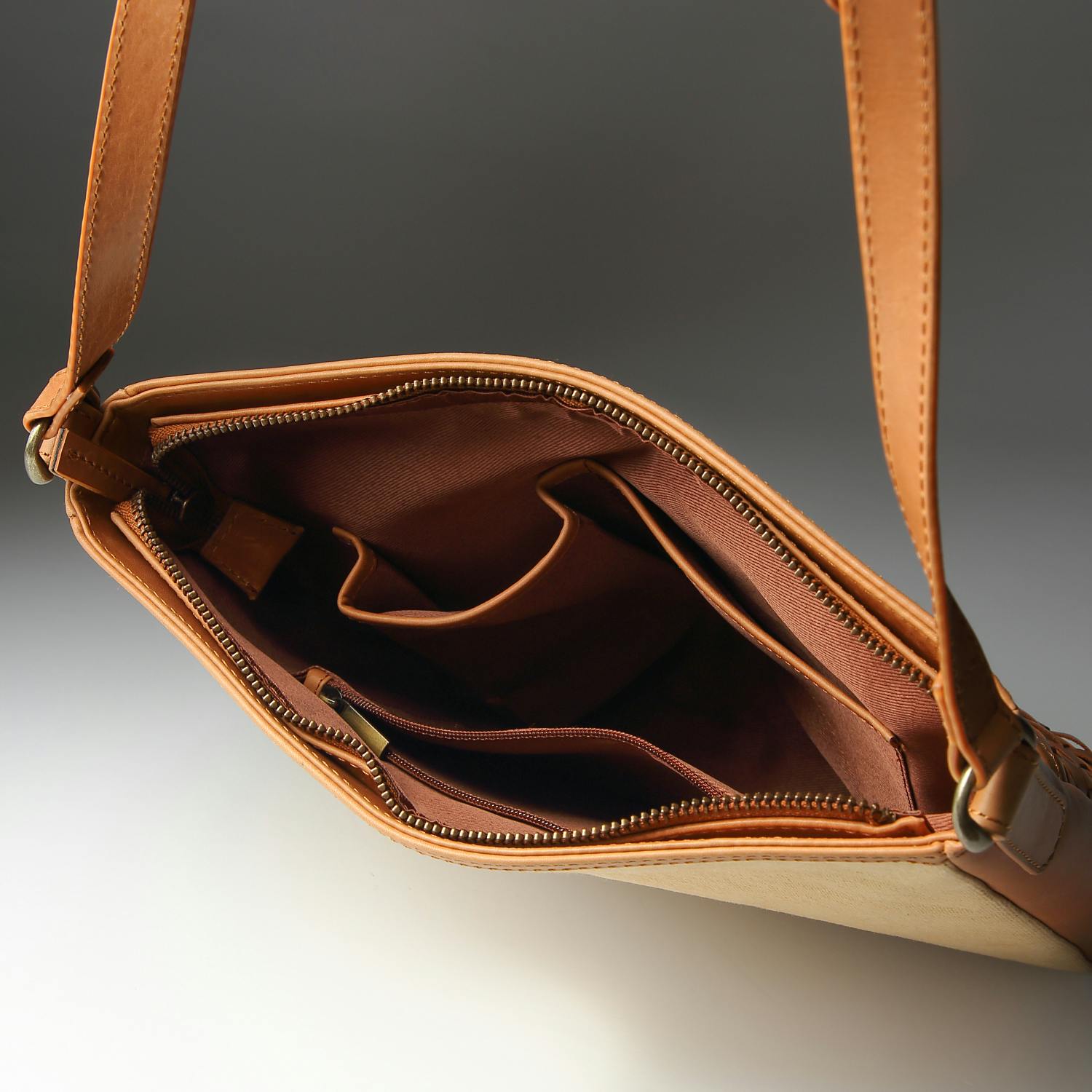 インナーには、ファスナーポケットを1つと、大小2つの小物ポケットを備えます。財布など大切なものもきちんと収納できて、散らかりにくい。取り出しやすいのもポイントです。
