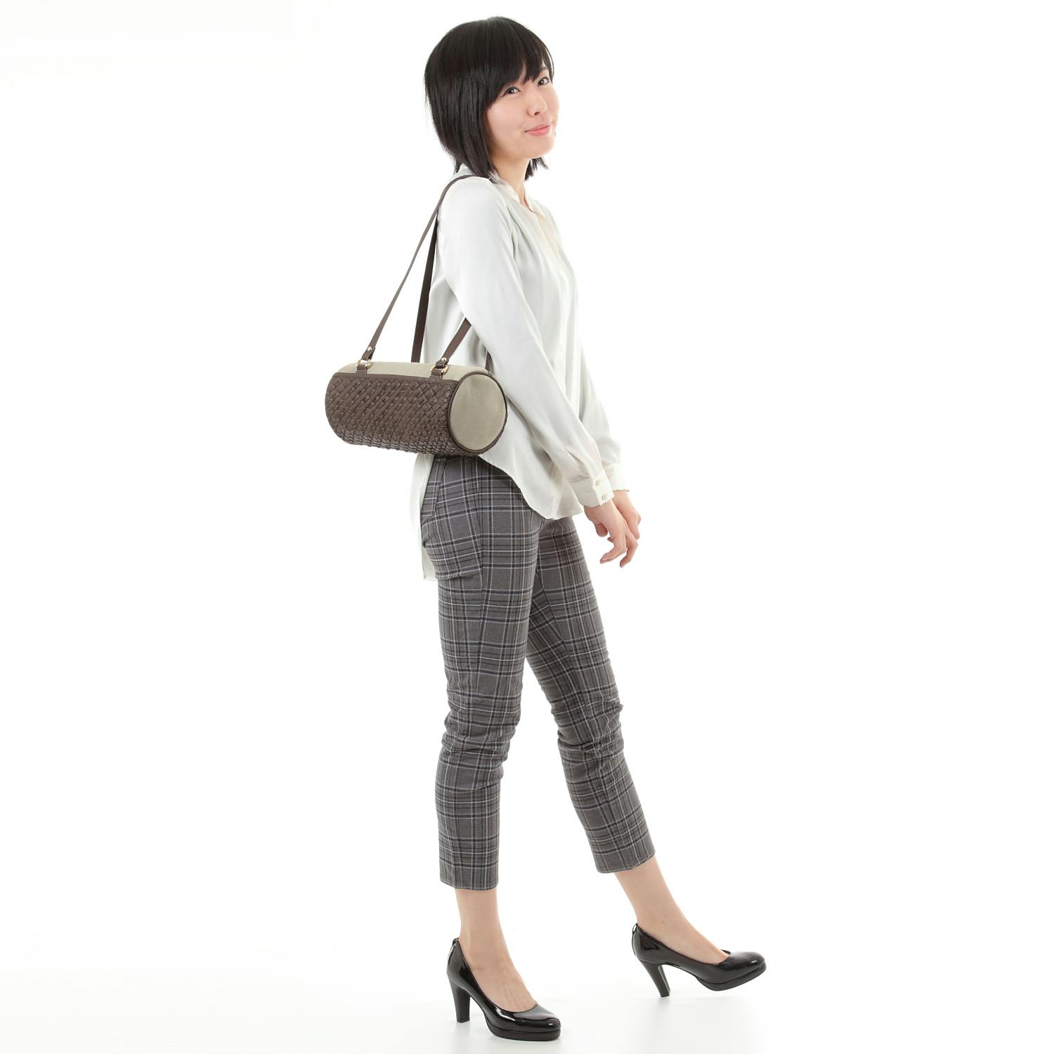 小ぶりで使いやすいサイズ感が可愛い、筒型のショルダーバッグです。前面のイントレチャート部分はマグネット留め付きで、ポケットとして使用できます。背面にもポケットが付属。頻繁に出し入れするものを収納するのに便利です。