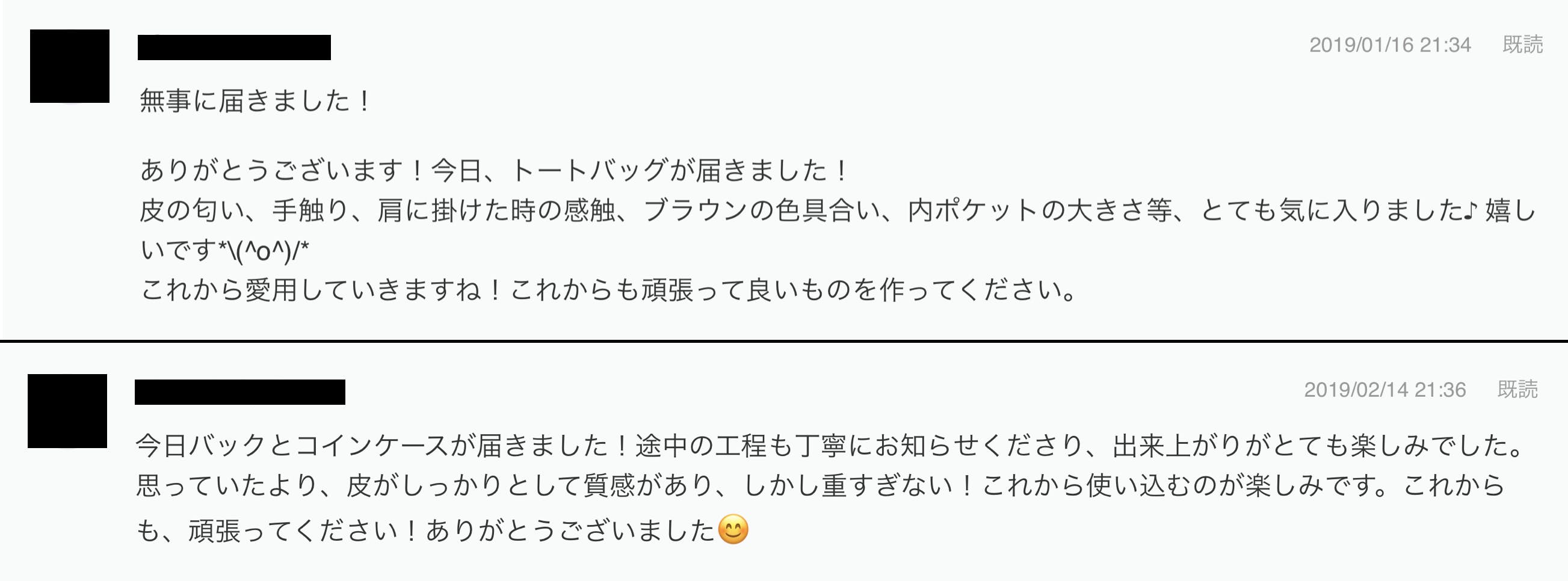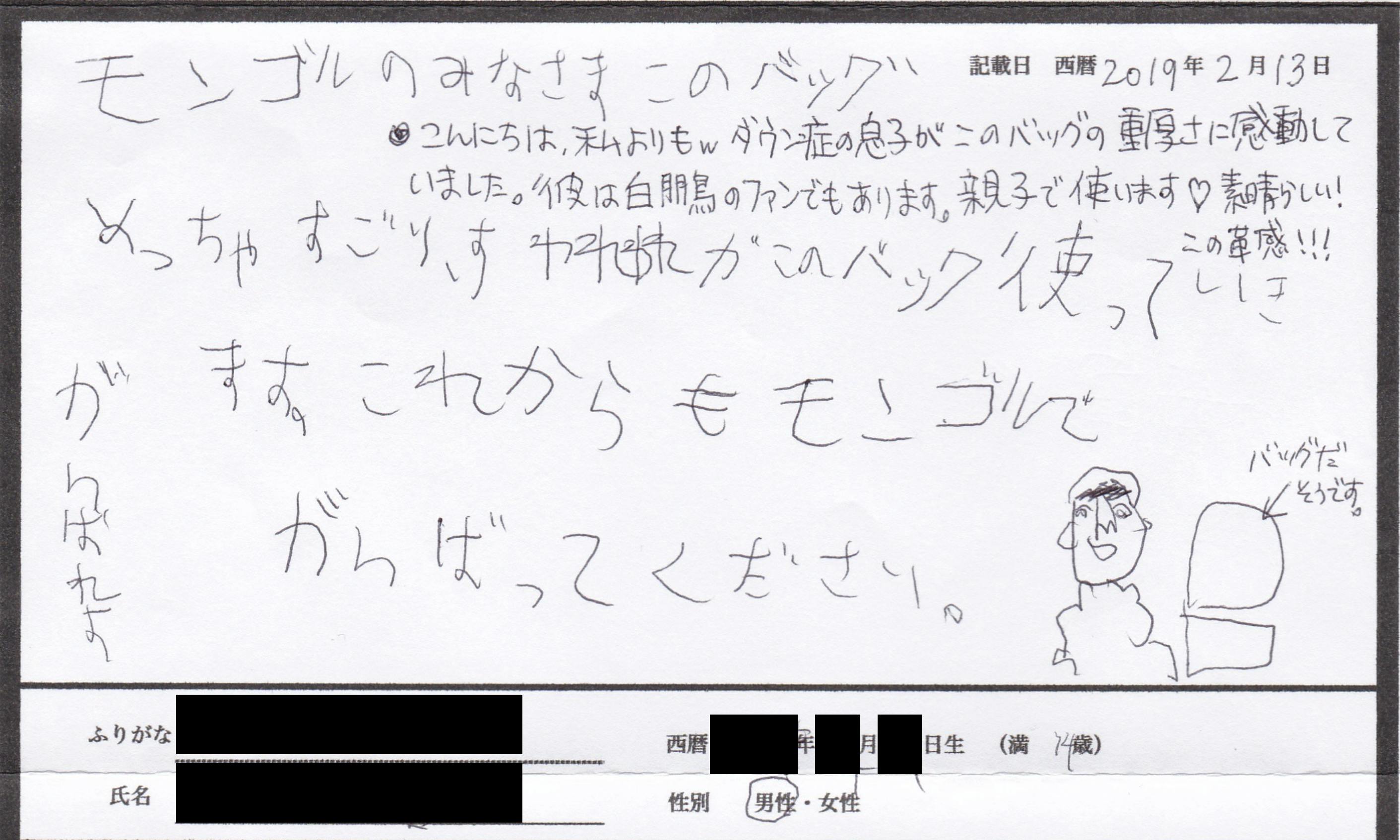 2019/05/31 14:15皆さんこんにちは!技術責任者の川田です。リターンのバッグやポーチはお手元に届きましたでしょうか?リターン製品を手にとっていただいた方からの嬉しい感想が届きましたので、ご紹介させていただきます。モンゴルの職人さんのことを気遣って英語で感想を書いていただいたり、上手な絵でわかりやすく感想を書いていただきました!本当にありがとうございます。通訳からどんなことが書いてあるかを聞いてます。職人さん達にも「こんな感想届きましたよー!」と伝えたところ、「おー!良かった!良かった!今日も仕事頑張る!」と言っていました(笑)感想はいつでも募集していますのでどしどしお願い致します!HushTug 川田大貴 もっと見るパトロンの皆様へ