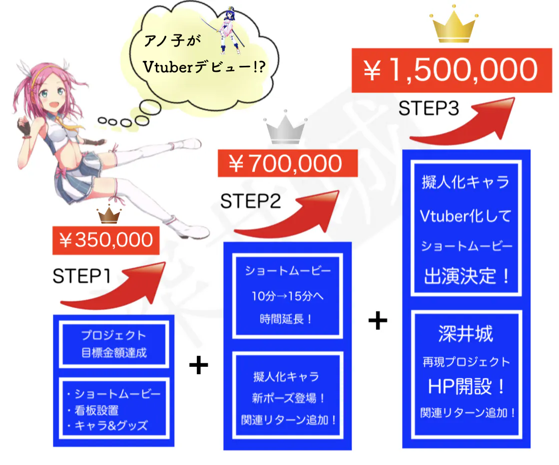 もし、目標金額(STEP1)の35万円を上回った場合は"ストレッチゴール"として、ネクスト目標を設定し、「ショートームービーの時間延長」「擬人化キャラ新ポーズ追加」、さらには「擬人化キャラのVtuberデビュー」など、プロジェクト内容をボリュームUPさせていただきます。