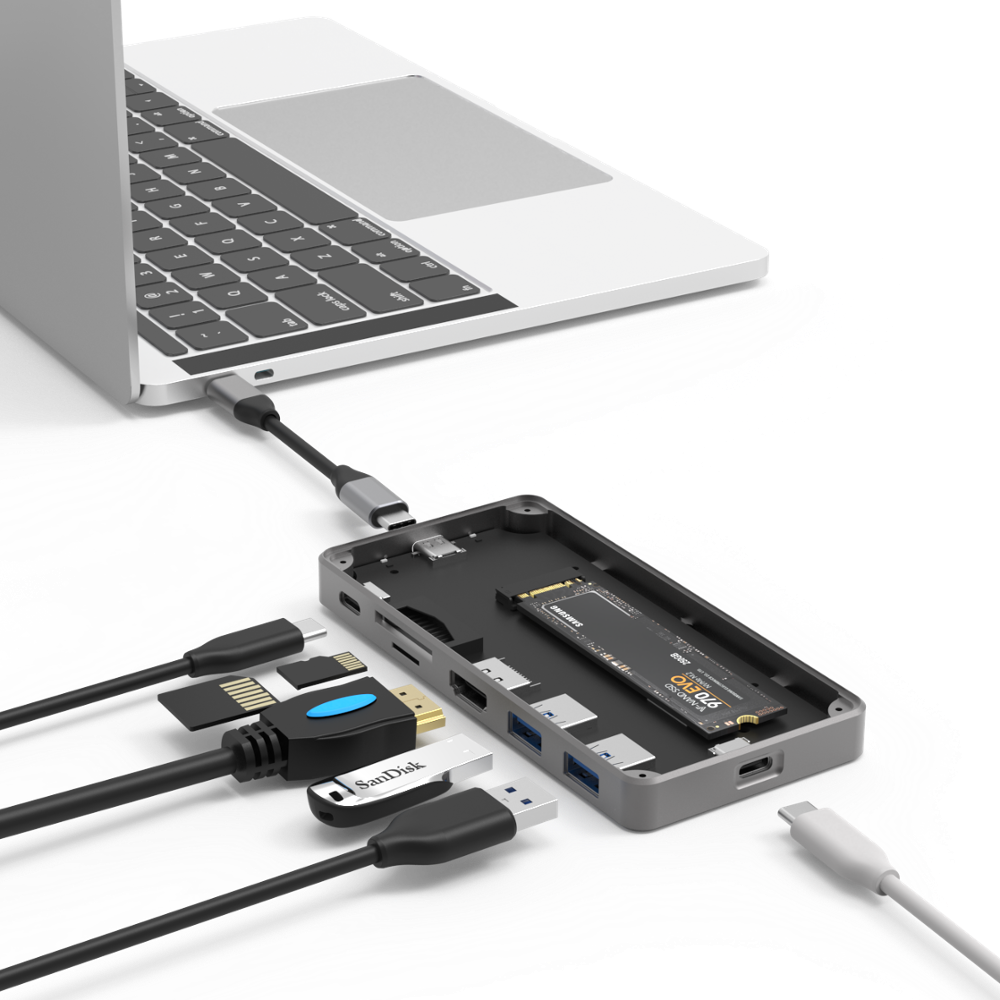 SSDストレージ拡張 7 in 1 USB-Cハブ は、PCがUSB-Cの端子だけなので複数のポートがほしいといったことや、PCの容量をもっと増やしたい、外部ディスプレイと高速に繋いで作業をしたい、といったニーズを満たしてくれます。