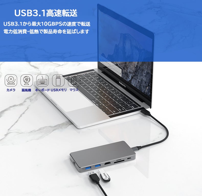 ⑥USB3.1インターフェース 10Gbps 理論レート高速伝送 キーボード・マウス・ハードディスク・小型ファンカメラなど接続可