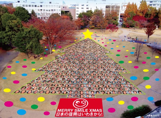 笑顔のまちづくりとして、いわき復興のメッセージを笑顔と一緒に発信するために、笑顔の傘で世界最大のMERRYなクリスマスツリーを完成させます。